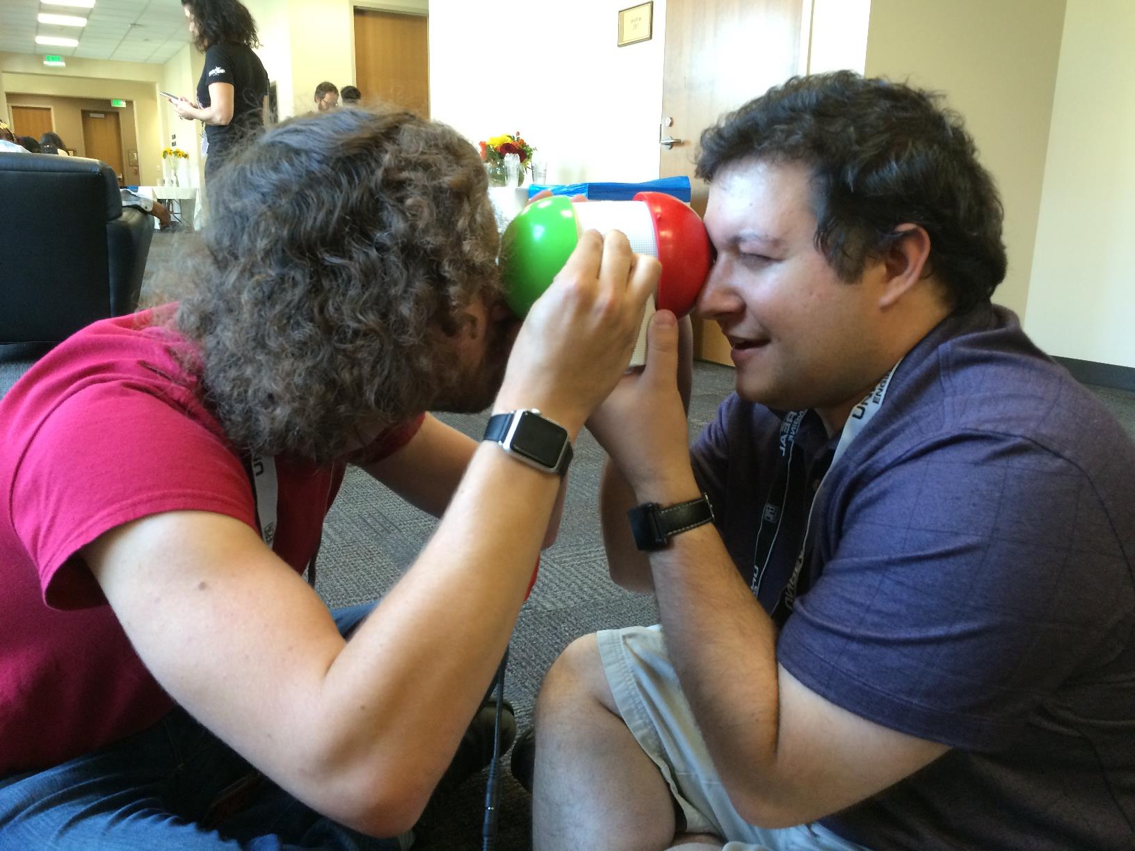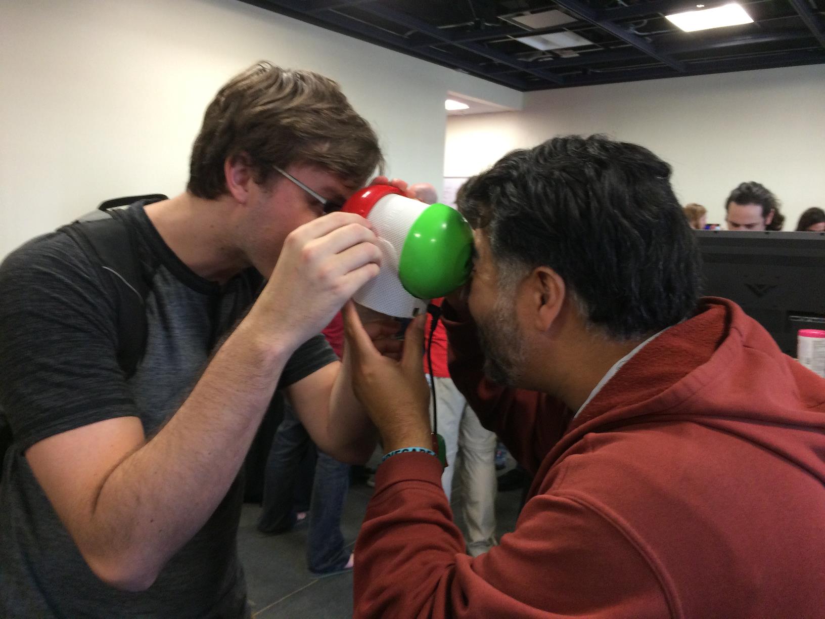 Each player views the action through a hole on either side of the capsule. A double sided little infinity mirror gives the perception of endless depth from either perspective. You control one of the LED's (either red or blue/green) with a knob that allows you to move clockwise or counterclockwise. The original rule was that the flashing LED will be who is "it" and will need to "catch" the other player. At that point the other player becomes "it" and the game switches roles and continues until the first person reaches six wins. The new version is red is always "it" but slower, and the sizes of both players dynamically change based on who won the last round.